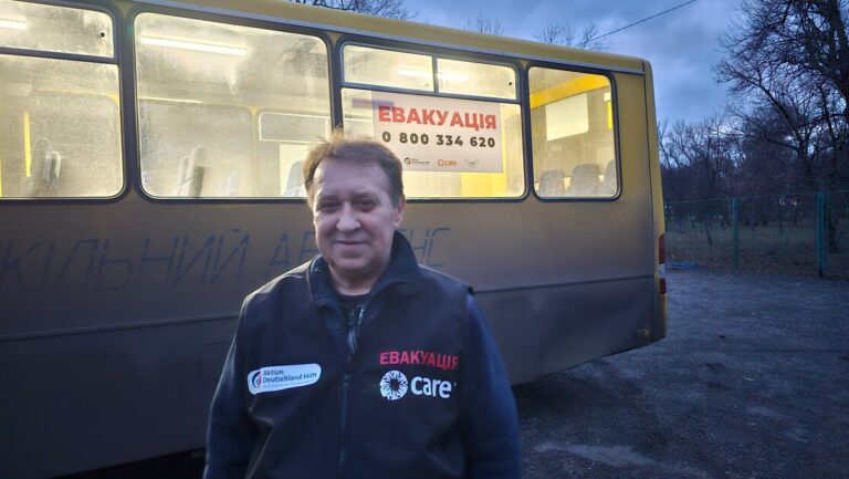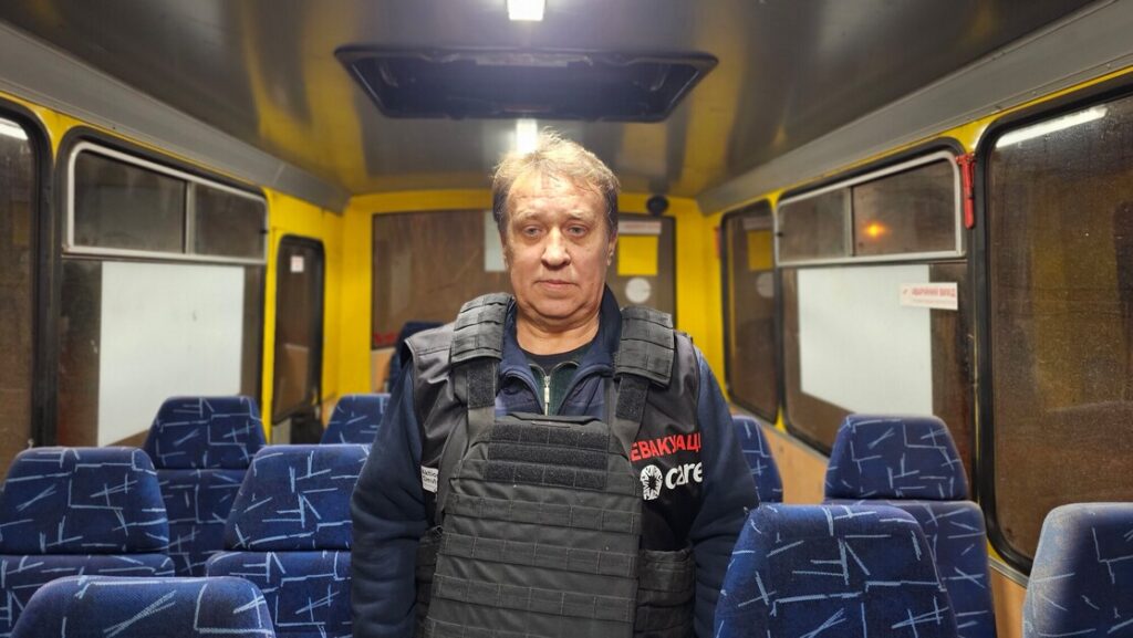 Vitalii řídí evakuační autobus pro partnerskou organizaci CARE. Převáží lidi z frontového města Prokrovsk do tranzitního centra, kde se o ně starají sociální pracovníci.