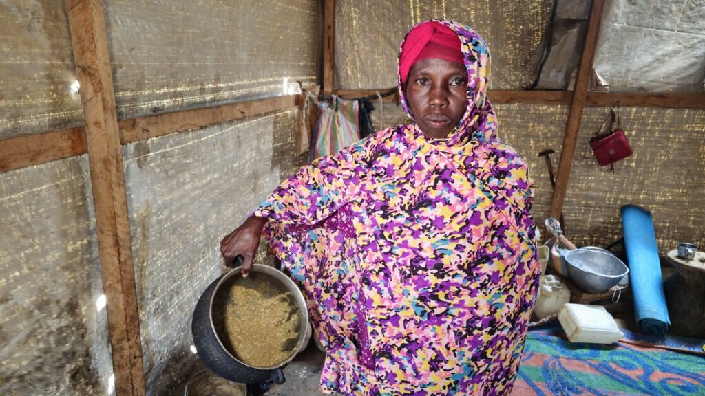 V srpnu 2024 poskytla organizace CARE Sadie a její rodině finanční pomoc, kterou použila na nákup 18 kilogramů mouky. Tyto zásoby však již došly. „Dělali jsme kaši, jen tolik, abychom přežili, ale nikdy ne dost, abychom se najedli dosyta. Nepamatuji si, kdy jsem naposledy jedla do sytosti,“ říká. Přístup k vodě je dalším bojem. Nejbližší pumpa je daleko od jejich chatrče a Sadia často vyráží již ve čtyři hodiny ráno, aby se po dlouhém čekání vrátila domů až za několik hodin. „Chodím sama, protože je tma a pro mé děti je to příliš nebezpečné. Vždy se bojím jít k pumpě, ale co jiného mám dělat? Zemřít?“