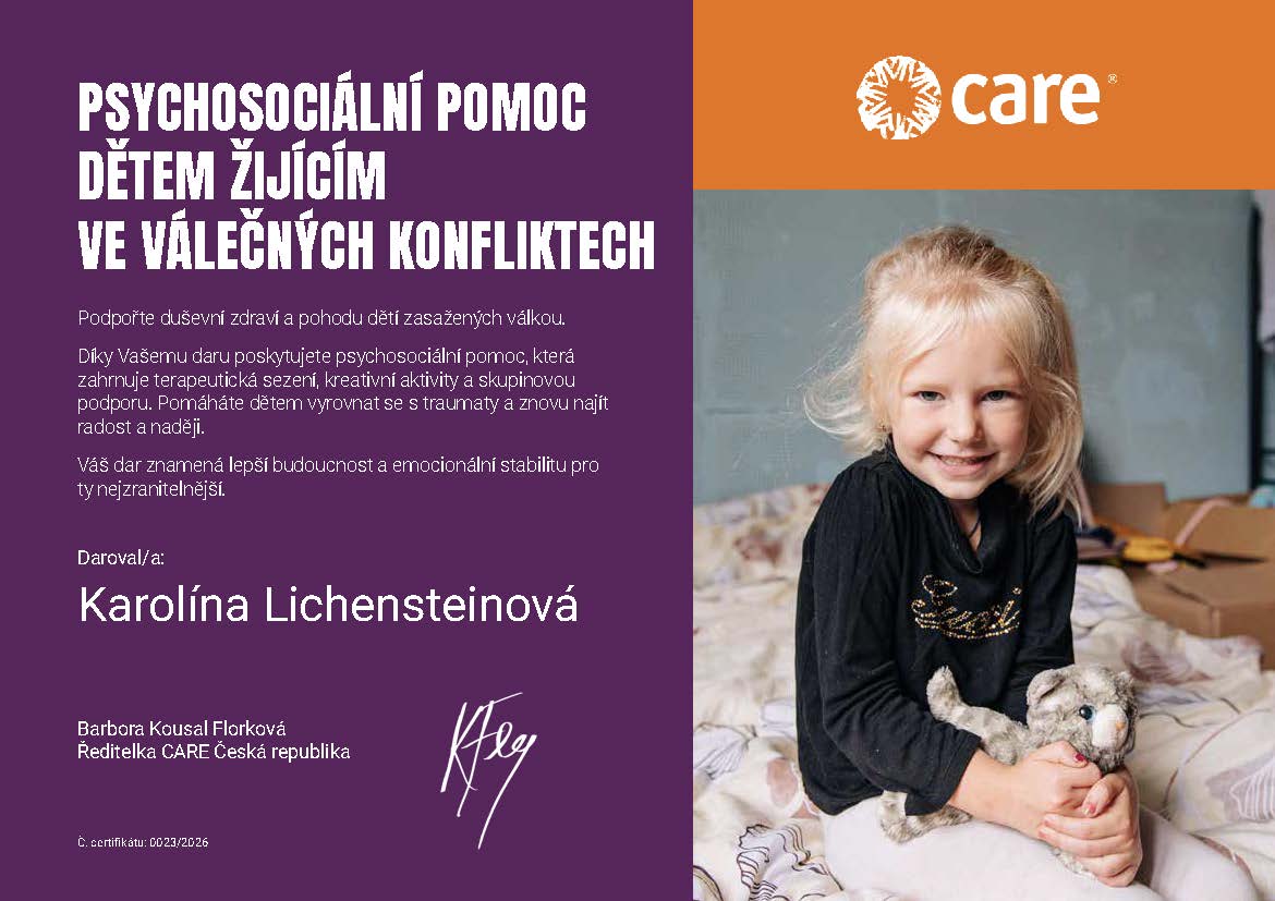 Podpořte duševní zdraví a pohodu dětí zasažených válkou! Za 1000 Kč poskytujete psychosociální pomoc, která zahrnuje terapeutická sezení, kreativní aktivity a skupinovou podporu. Pomáháte dětem vyrovnat se s traumaty a znovu najít radost a naději. Váš dar znamená lepší budoucnost a emocionální stabilitu pro ty nejzranitelnější. Darujte naději a podporu dětem postiženým válkou zejména v Ukrajině, Gaze, Sýrii, Súdánu a Jemenu.