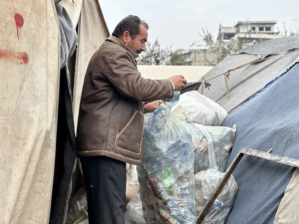 Každé ráno Abú Mahmúd sbírá plastové lahve s vodou z velkého kontejneru na odpadky vedle svého stanu. Poté je spálí v kamnech uvnitř svého provizorního stanu v Afrínu. Šestapadesátiletý otec dvanácti dětí si je vědom velkých zdravotních rizik spojených s dýcháním emisí ze spáleného plastu, ale vyhnout se této praxi nepřipadá v úvahu, protože by to znamenalo, že rodina zůstane jen vystavena mrazu.